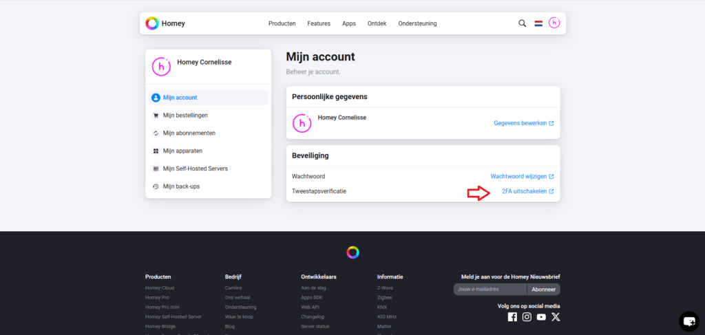Het inschakelen van 2FA op Homey doe je via je accountpagina. Ga naar https://homey.app/account en log in. Ga naar het kopje beveiliging en kies voor het inschakelen van tweefactorauthenticatie. Vervolgens koppel je een authenticator app door de QR-code te scannen die wordt getoond.
