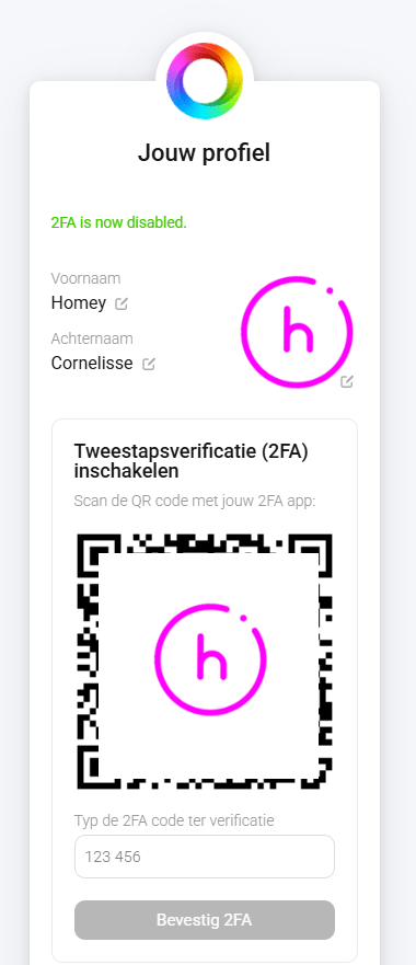 Na het scannen van de QR-code voert je de gegenereerde code in om de activatie te bevestigen. Sluit de pagina pas wanneer je zeker weet dat 2FA actief is. Log daarna een keer uit en weer in om te testen of er om de extra code wordt gevraagd. Zo weet je zeker dat alles correct werkt.