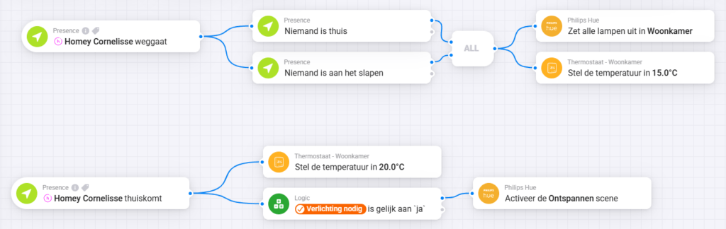 Een praktisch voorbeeld is een flow die wordt geactiveerd zodra iemand het huis verlaat. In dat geval worden verlichting en verwarming automatisch uitgeschakeld. Bij thuiskomst wordt het huis alvast voorverwarmd en gaat de verlichting aan zodra de voordeur wordt geopend.